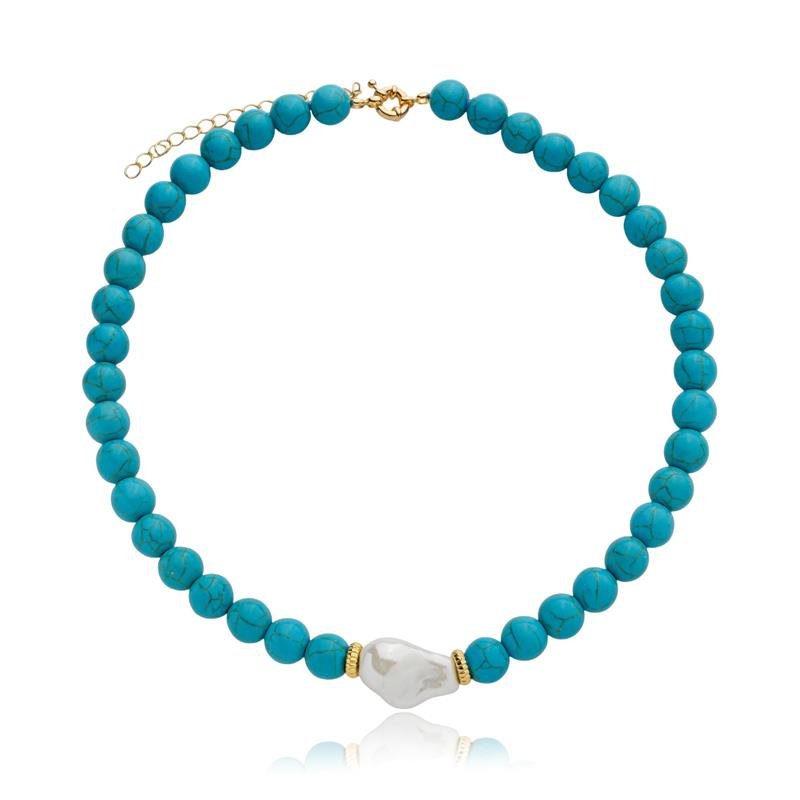 Colar Pedra Natural Azul Turquesa com Pérola Barroca, semijoia banhado a ouro 18k e desenvolvida com tecnologia hipoalergênica.Dica de uso: Um toque de sofisticação em cada detalhe, este colar combina esferas em pedra natural azul turquesa com o charme orgânico da pérola barroca central. Com 40cm de comprimento, é uma peça elegante e versátil, ideal para quem busca estilo e autenticidade.