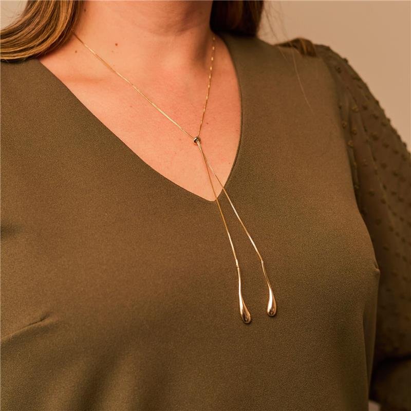 Colar Gravata Gotas Lisas, semijoia banhado a ouro 18k e desenvolvida com tecnologia hipoalergênica.Dica de uso: Moderno e sofisticado, o colar gravatinha com gotas lisas traz um design elegante e fluido, que alonga o colo com leveza. As gotas com acabamento polido refletem a luz com sutileza, criando um visual delicado e ao mesmo tempo marcante. Ideal para compor desde produções minimalistas até combinações mais elaboradas, é uma peça versátil que transmite feminilidade e estilo em qualquer ocasião.