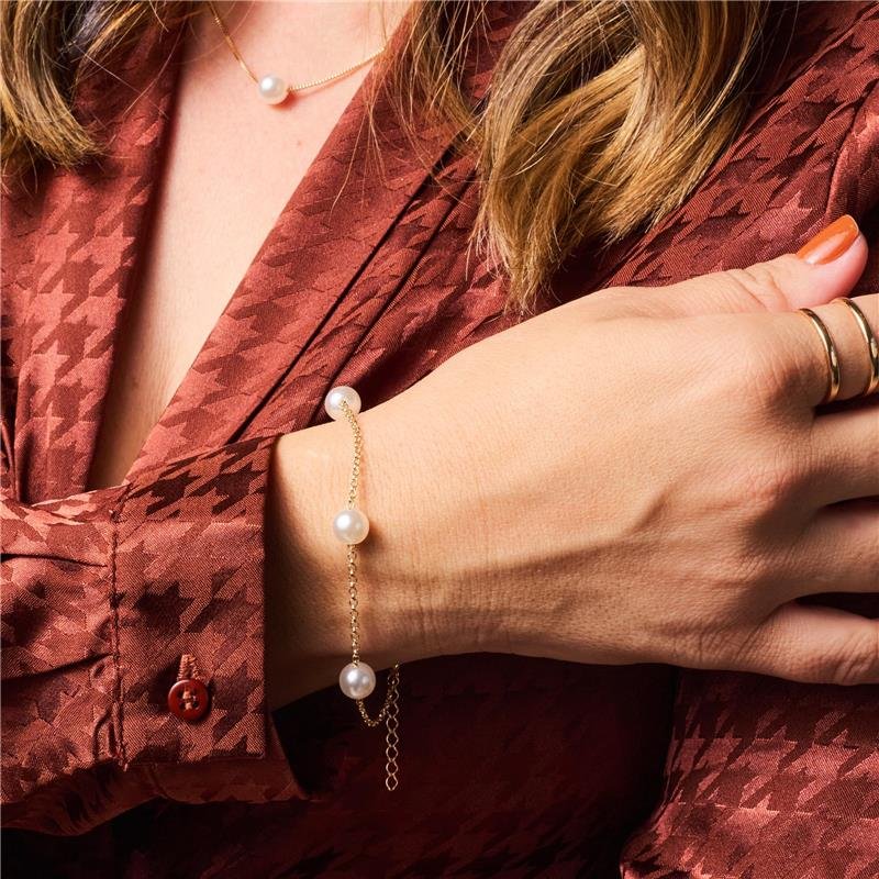 Pulseira com pérolas, semijoia banhado a ouro 18k e desenvolvido com tecnologia hipoalergênica.Dica de uso: Composta por uma delicada corrente de mini elos portugueses e pérolas distribuídas de forma equilibrada, esta pulseira é um verdadeiro charme. O contraste entre a textura da corrente e o brilho das pérolas resulta em uma peça delicada, moderna e extremamente feminina. Ideal para ser usada sozinha ou em composições com outras pulseiras, garantindo um visual elegante em qualquer ocasião.