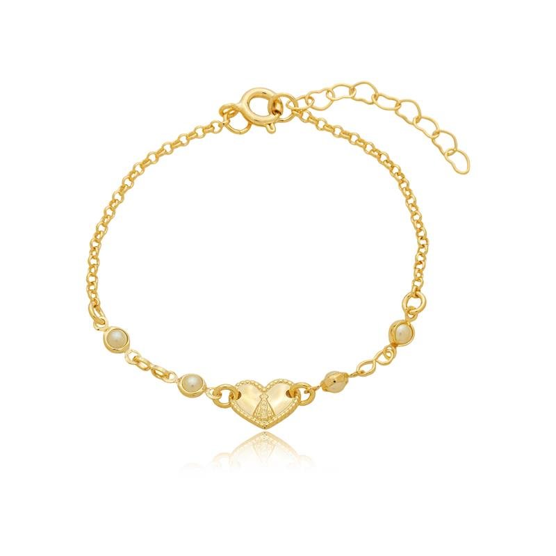 Pulseira infantil elo português com mini pérolas e pingente coração Nossa Senhoa Aparecida, semijoia banhado em ouro 18k e desenvolvida com tecnologia hipoalergênica.Delicada e cheia de significado, nossa pulseira infantil foi criada para acompanhar as pequenas com proteção e charme. Composta por mini pérolas, ela traz um toque de elegância suave, perfeito para crianças. O destaque fica por conta do pingente de Nossa Senhora Aparecida, símbolo de fé, amor e cuidado, que torna a peça ainda mais especial.